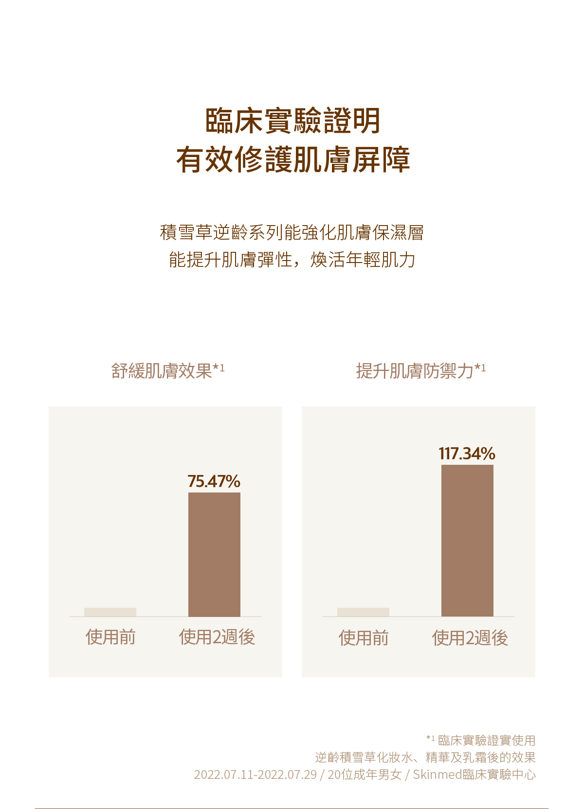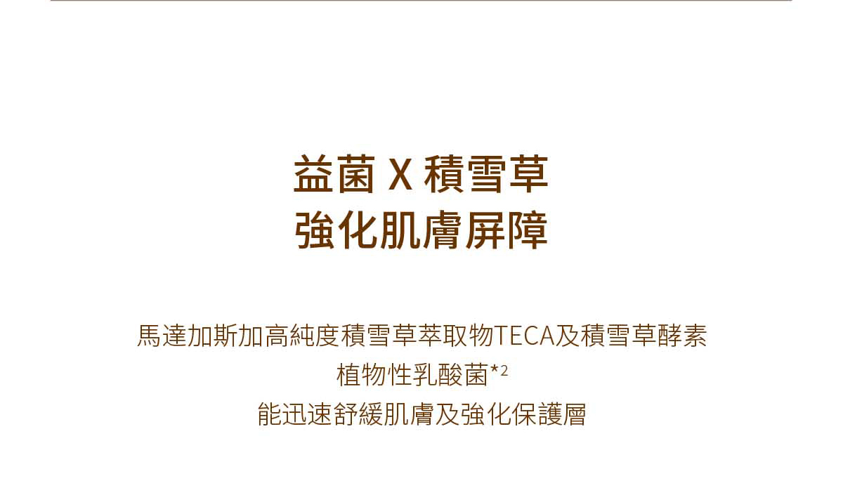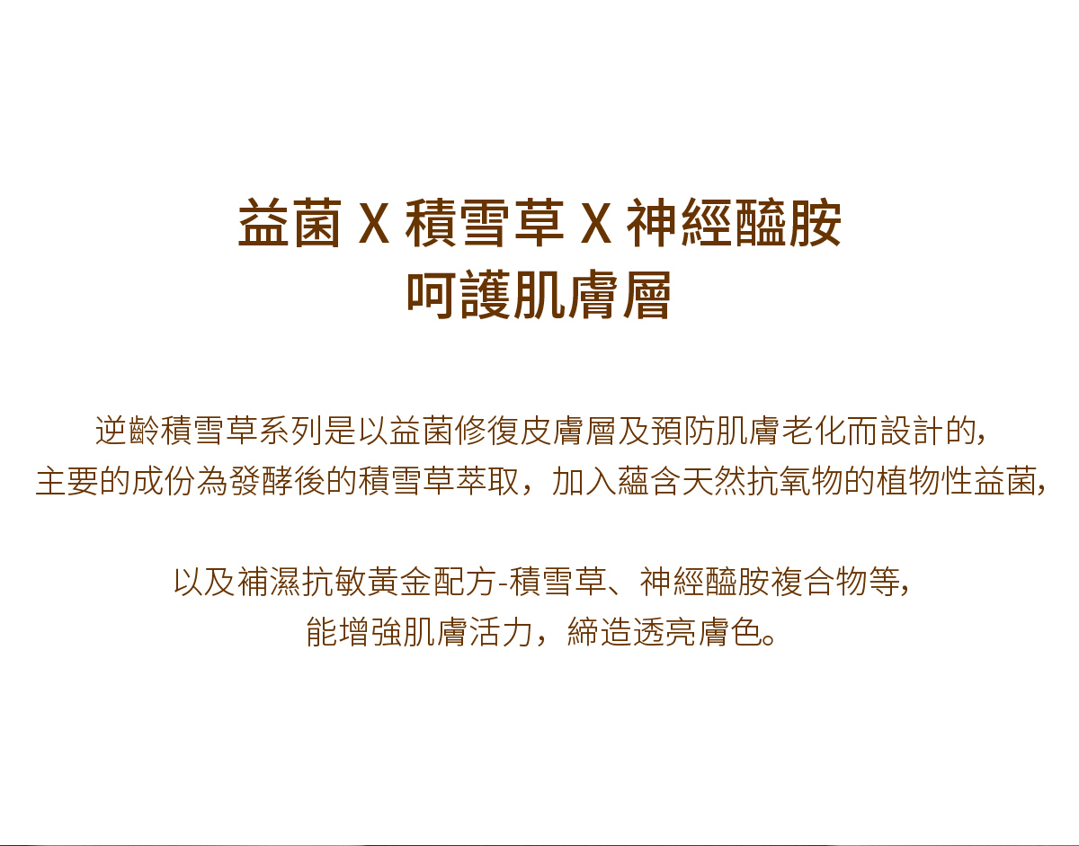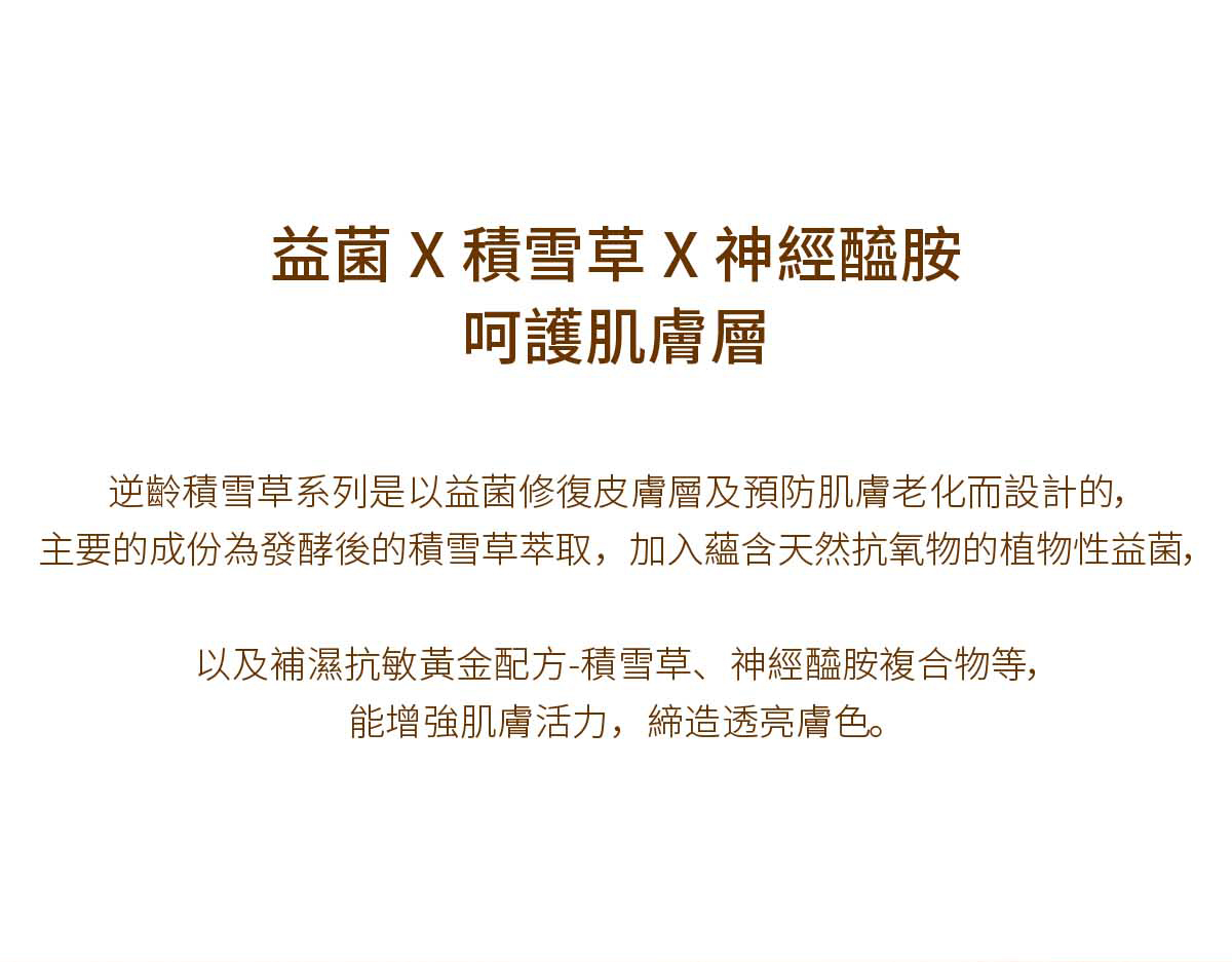 -逆齡積雪草系列是以益菌修復皮膚層及預防肌膚老化而設計的,