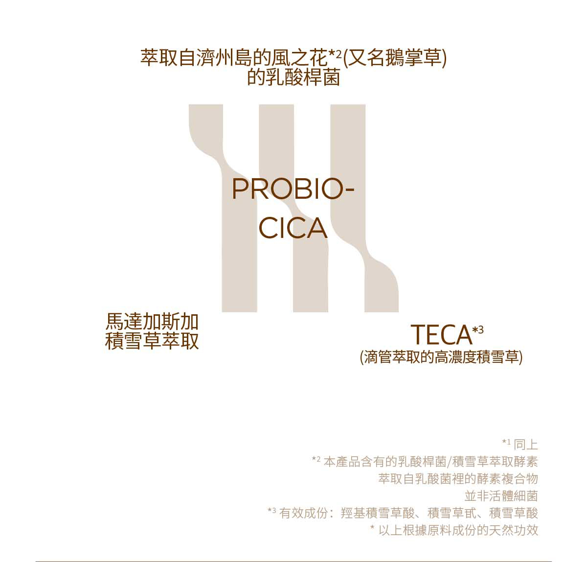 主要的成份為發酵後的積雪草萃取,加入蘊含天然抗氧物的植物性益菌,