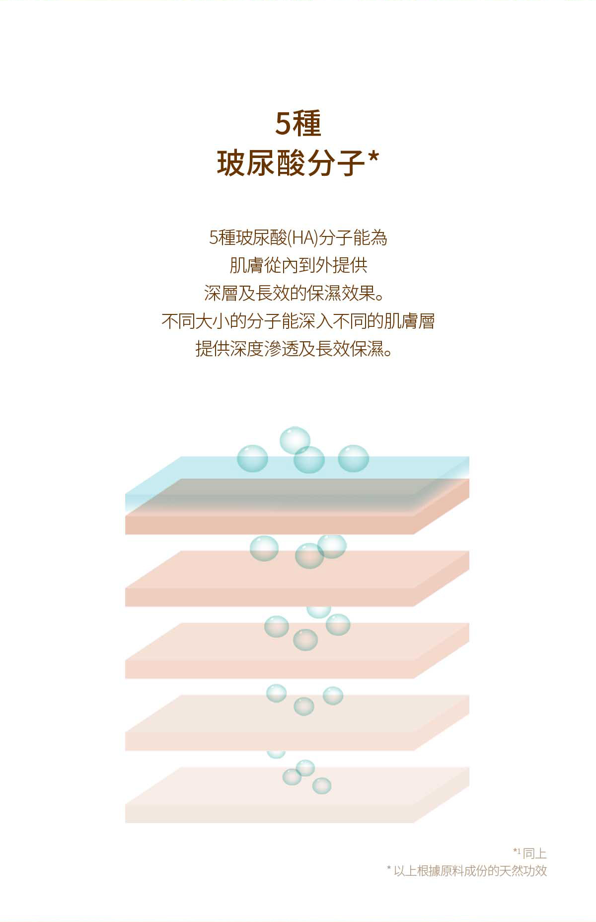 -5種玻尿酸(HA)分子能為肌膚從內到外提供深層及長效的保濕效果。