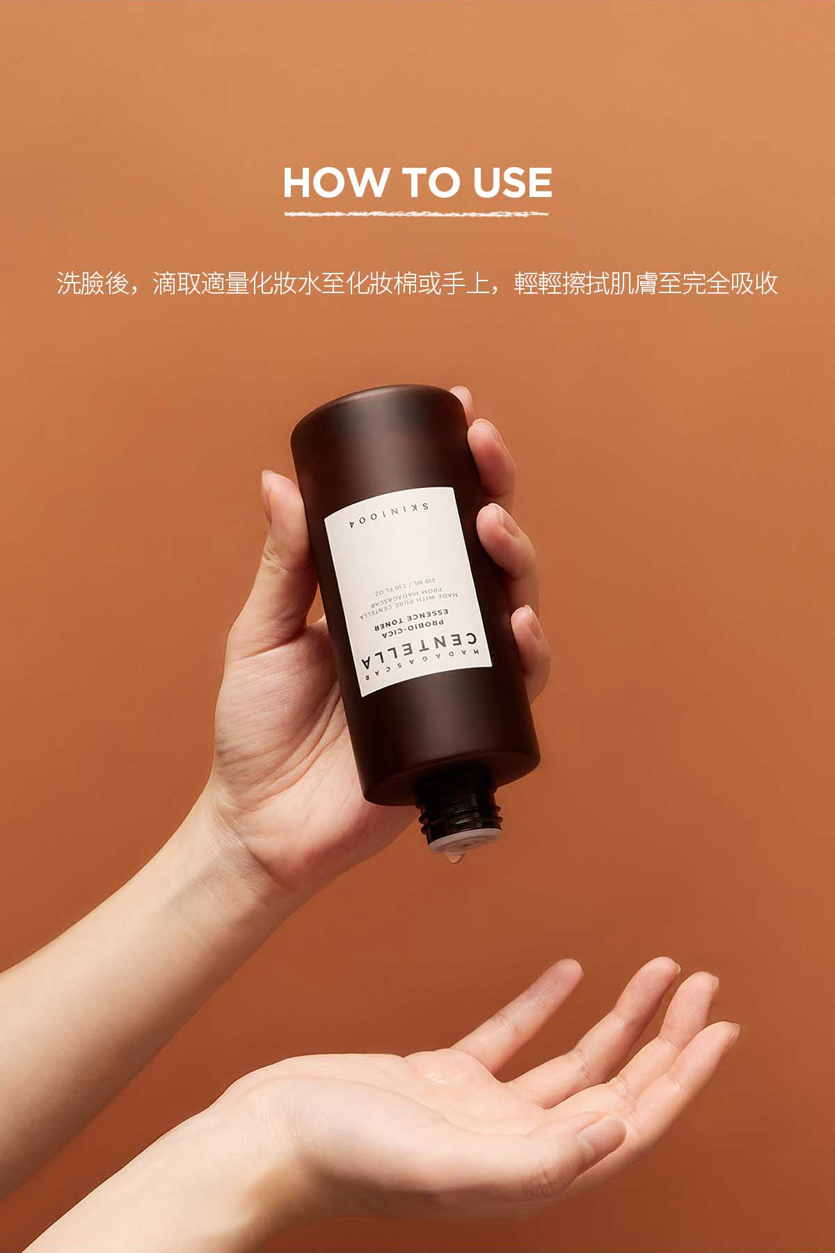 洗臉後,滴取適量化妝水至化妝棉或手上,輕輕擦拭肌膚至完全吸收