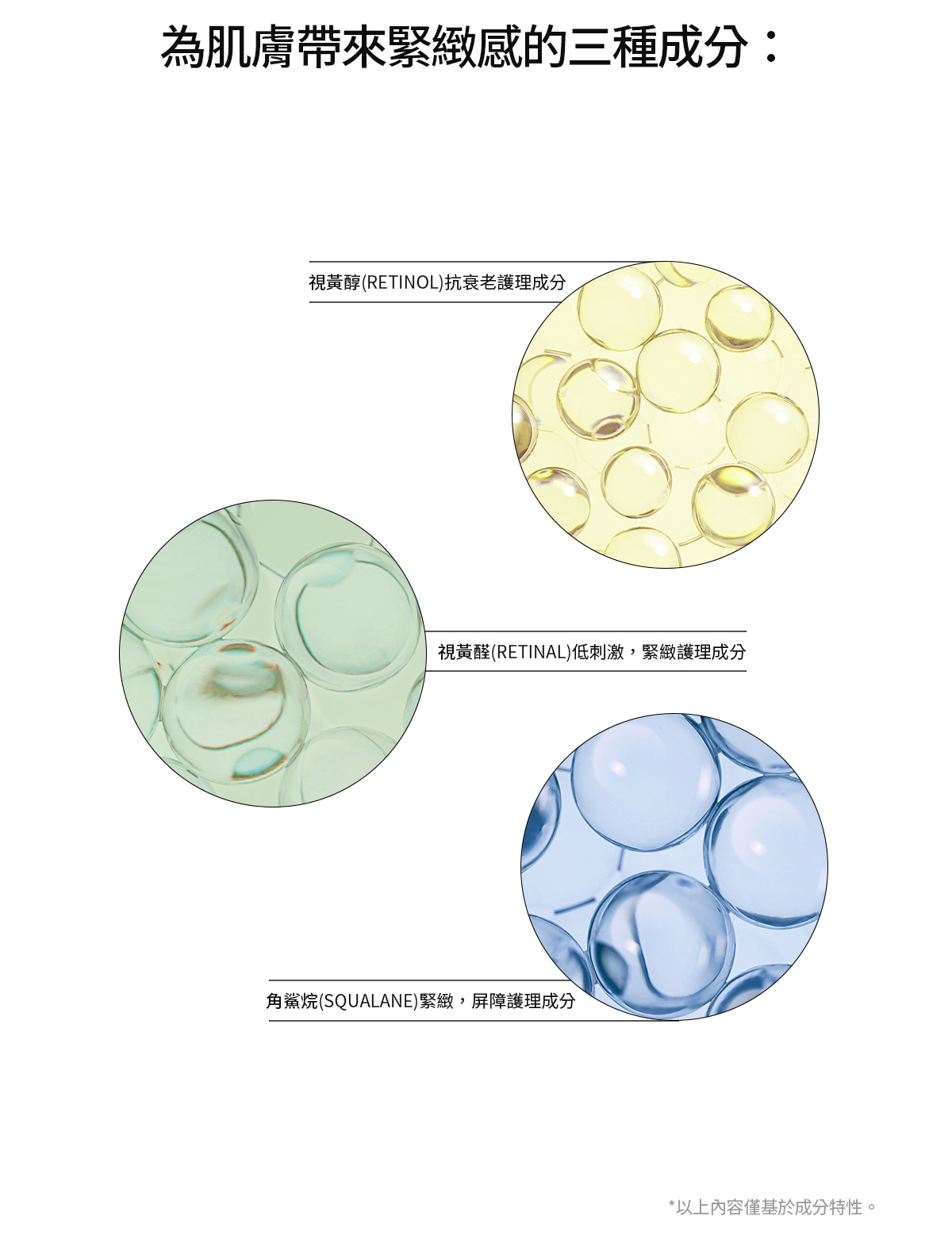 -緊緻肌膚的代表性成分:視黃醇+視黃醛+角鯊烷