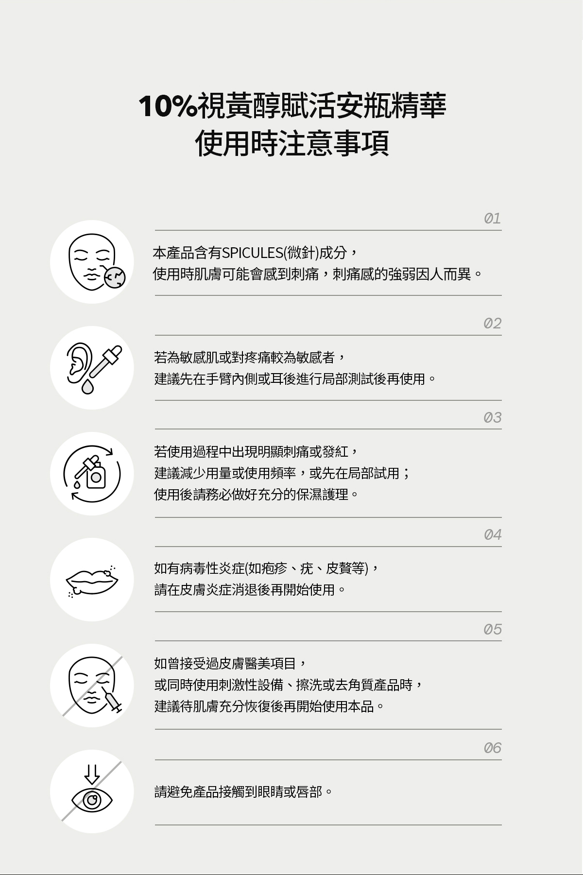 根據肌膚適應程度,可每天或隔天夜間使用(每處約0.5ml或全臉少量塗抹)