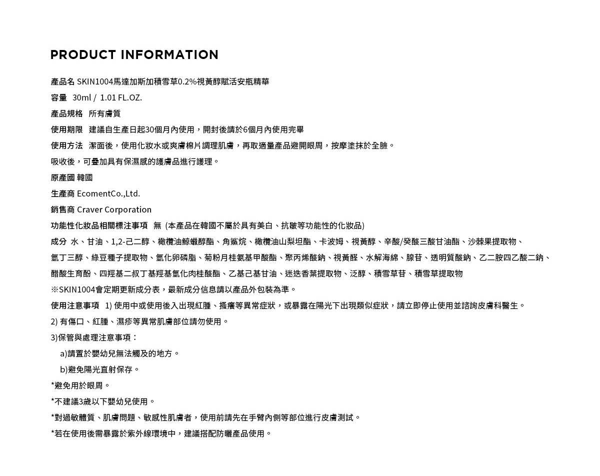 品名:SKIN1004理膚天使 馬達加斯加積雪草 安瓶系列 ▸ A醇賦活精華