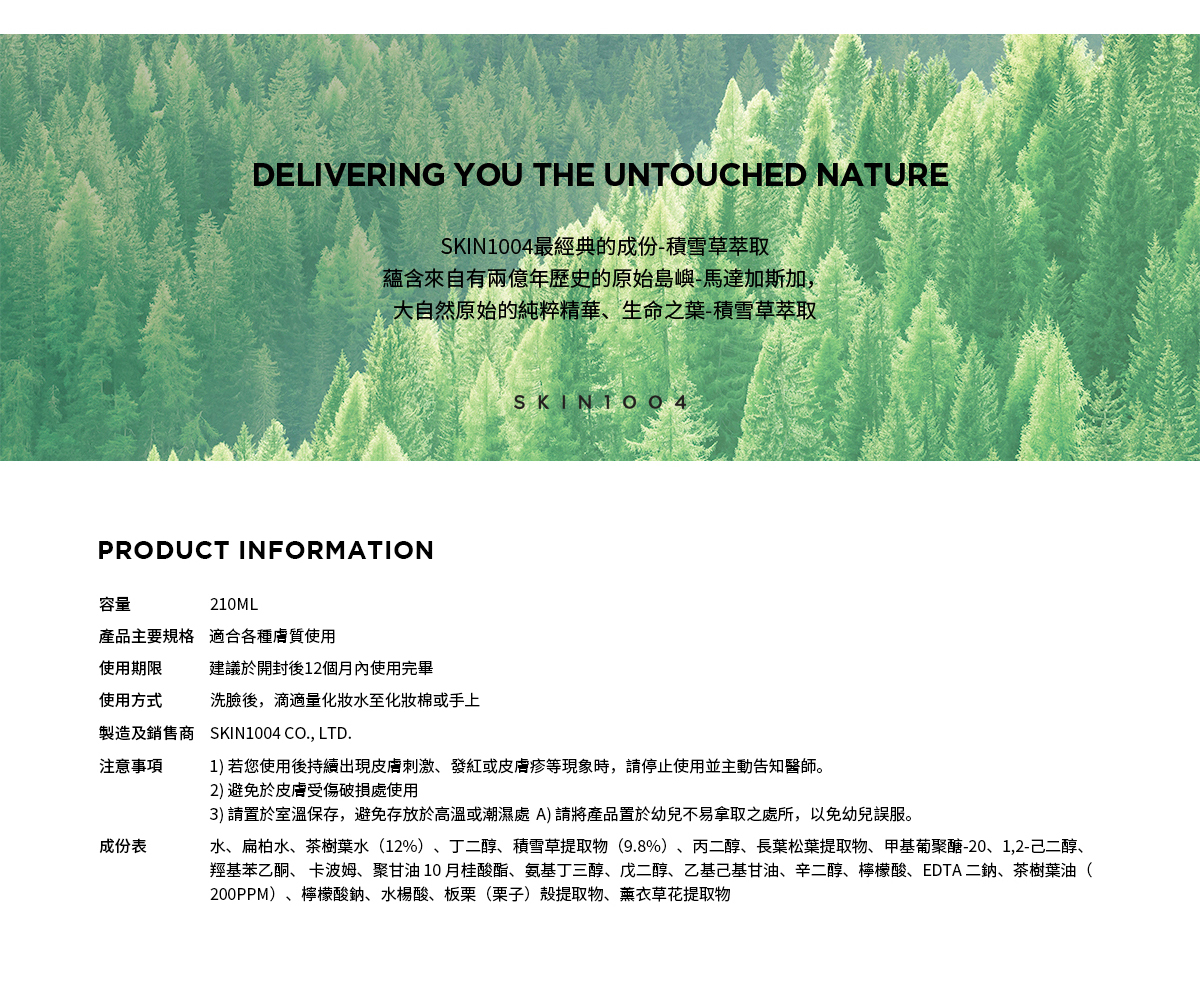 品名:SKIN1004理膚天使 馬達加斯加積雪草[茶樹]-淨膚控油化妝水 210ml