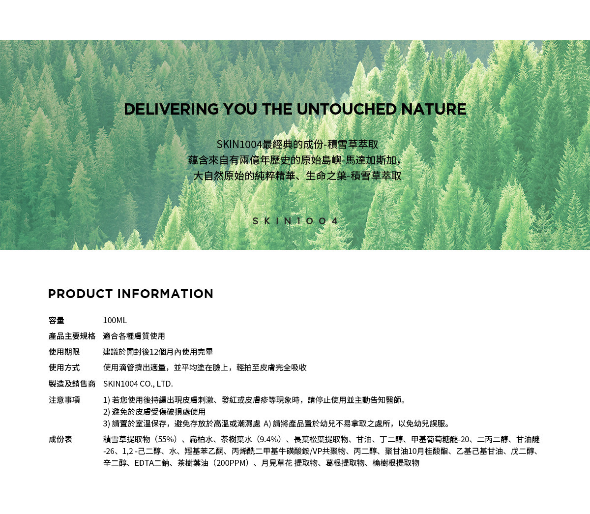 積雪草提取物(55%)、扁柏水、茶樹葉水(9.4%)、長葉松葉提取物、甘油、丁二醇、甲基葡萄糖醚-20、二丙二醇、