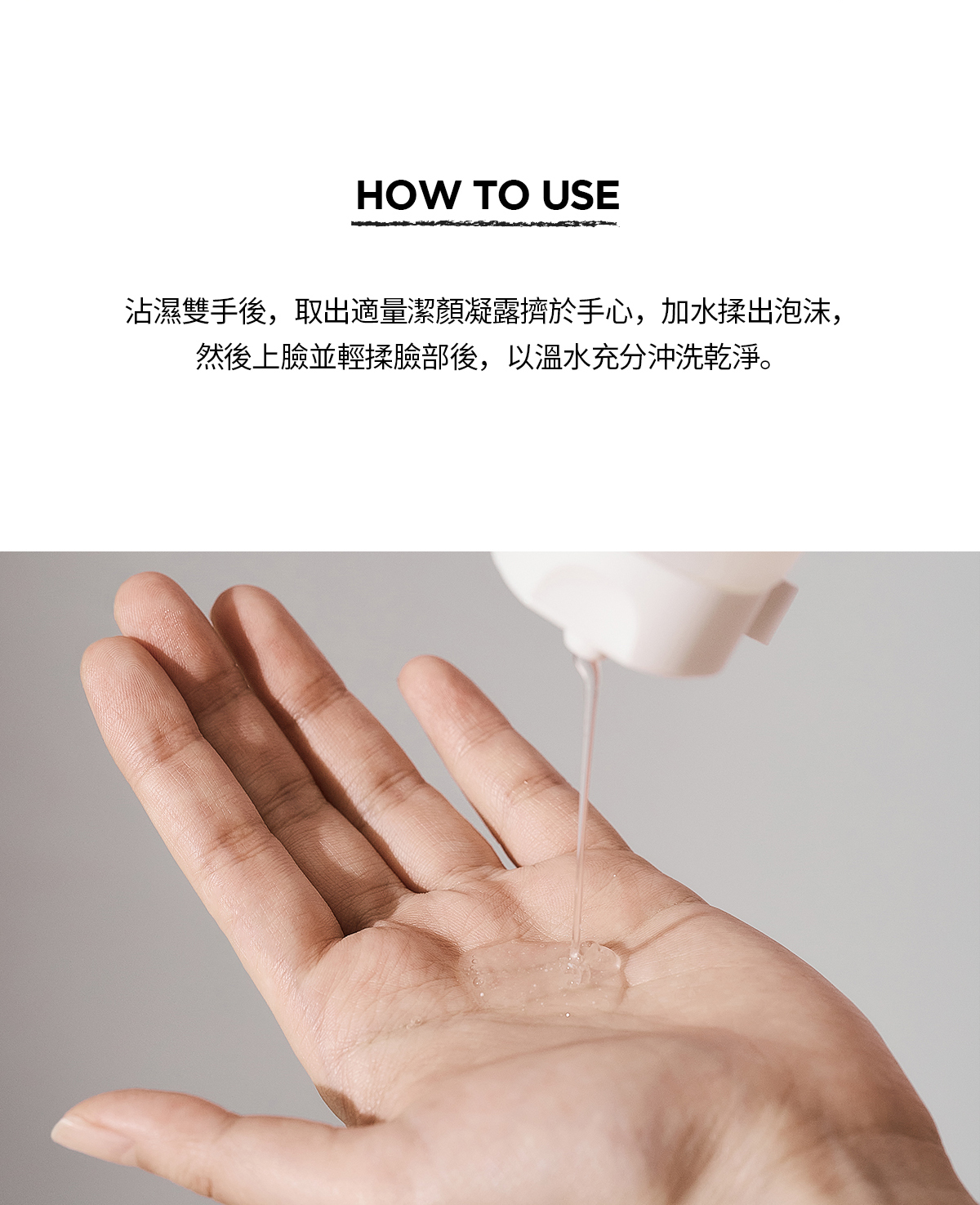 沾濕雙手後,取出適量潔顏凝露擠於手心,加水揉出泡沫,然後上臉並輕揉臉部後,以溫水充分沖洗乾淨。