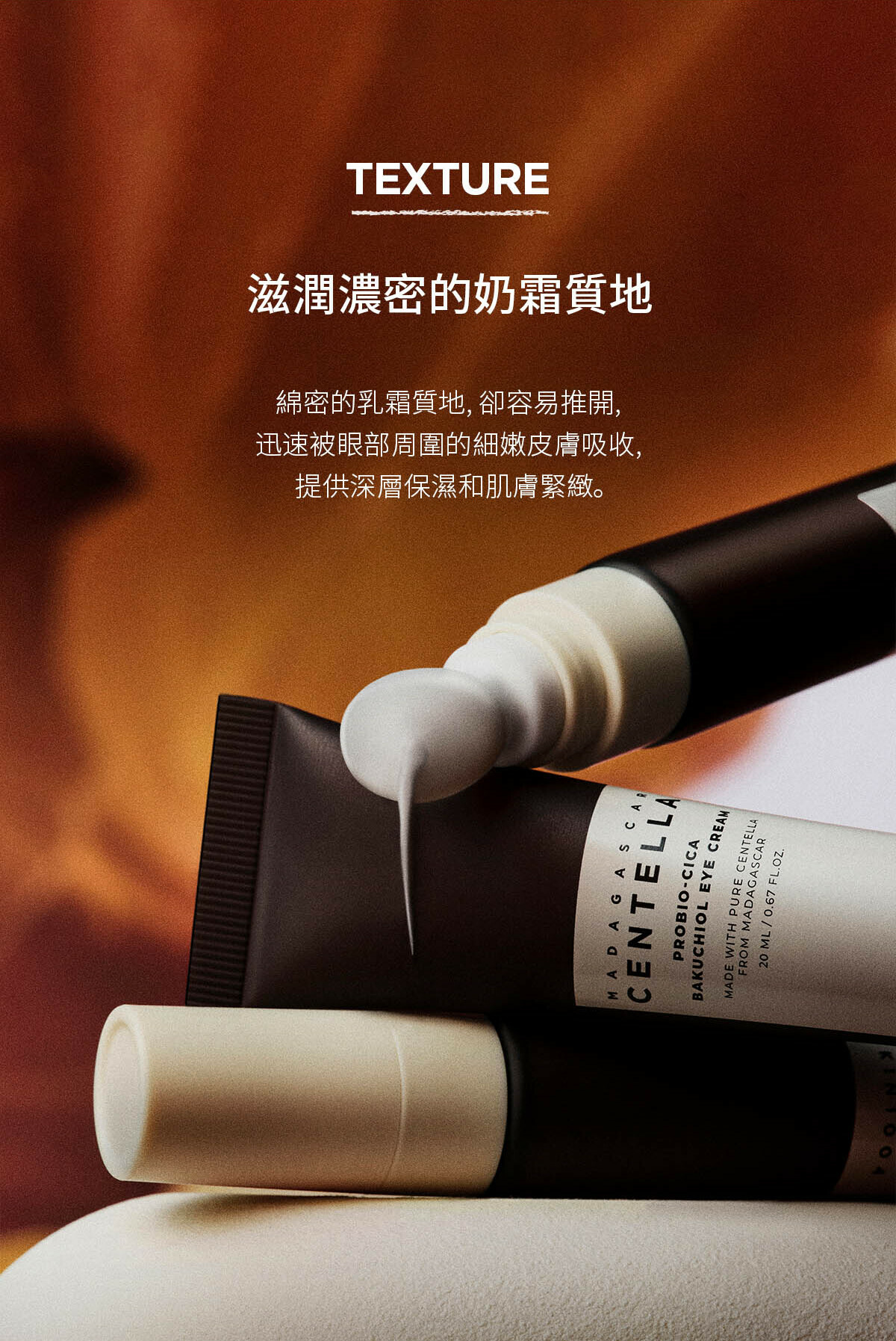 -乳霜質地,容易推開,迅速被眼部周圍皮膚吸收