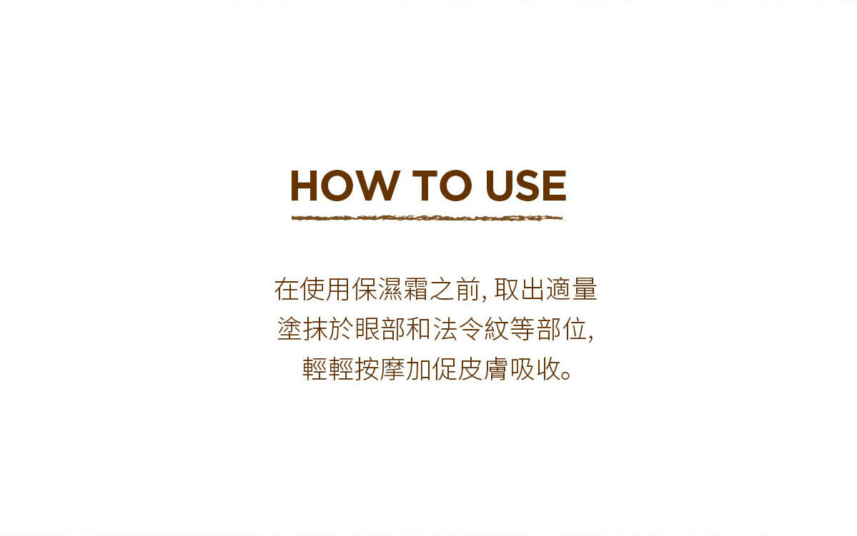 在使用保濕霜之前,取出適量塗抹於眼部和法令紋等部位,輕輕按摩加促皮膚吸收