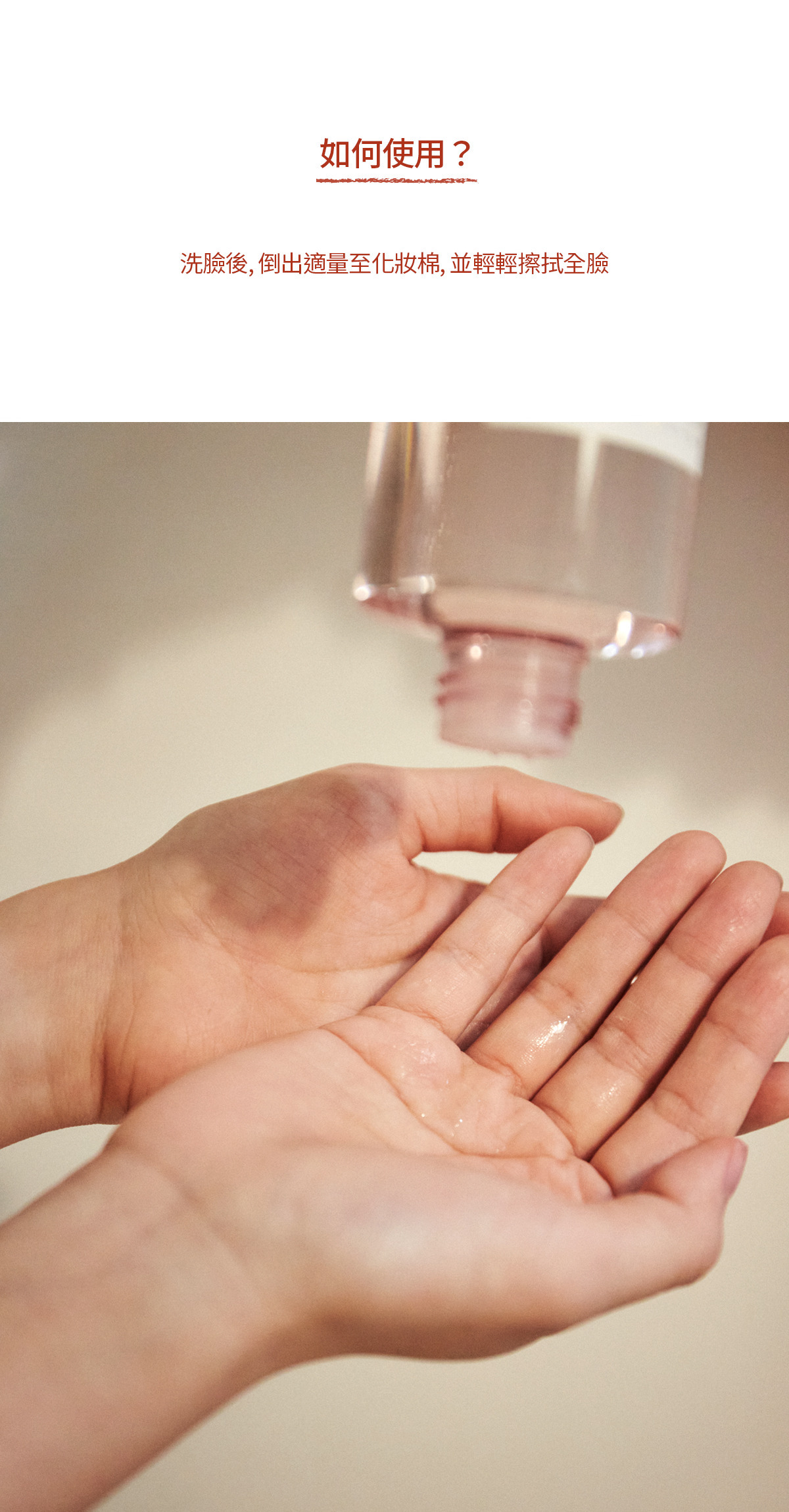 1. 輕拍 :適量沾濕化妝棉後,由臉部中央朝外側輕拍, 由下至上托著肌膚輕輕拍打至均勻水潤