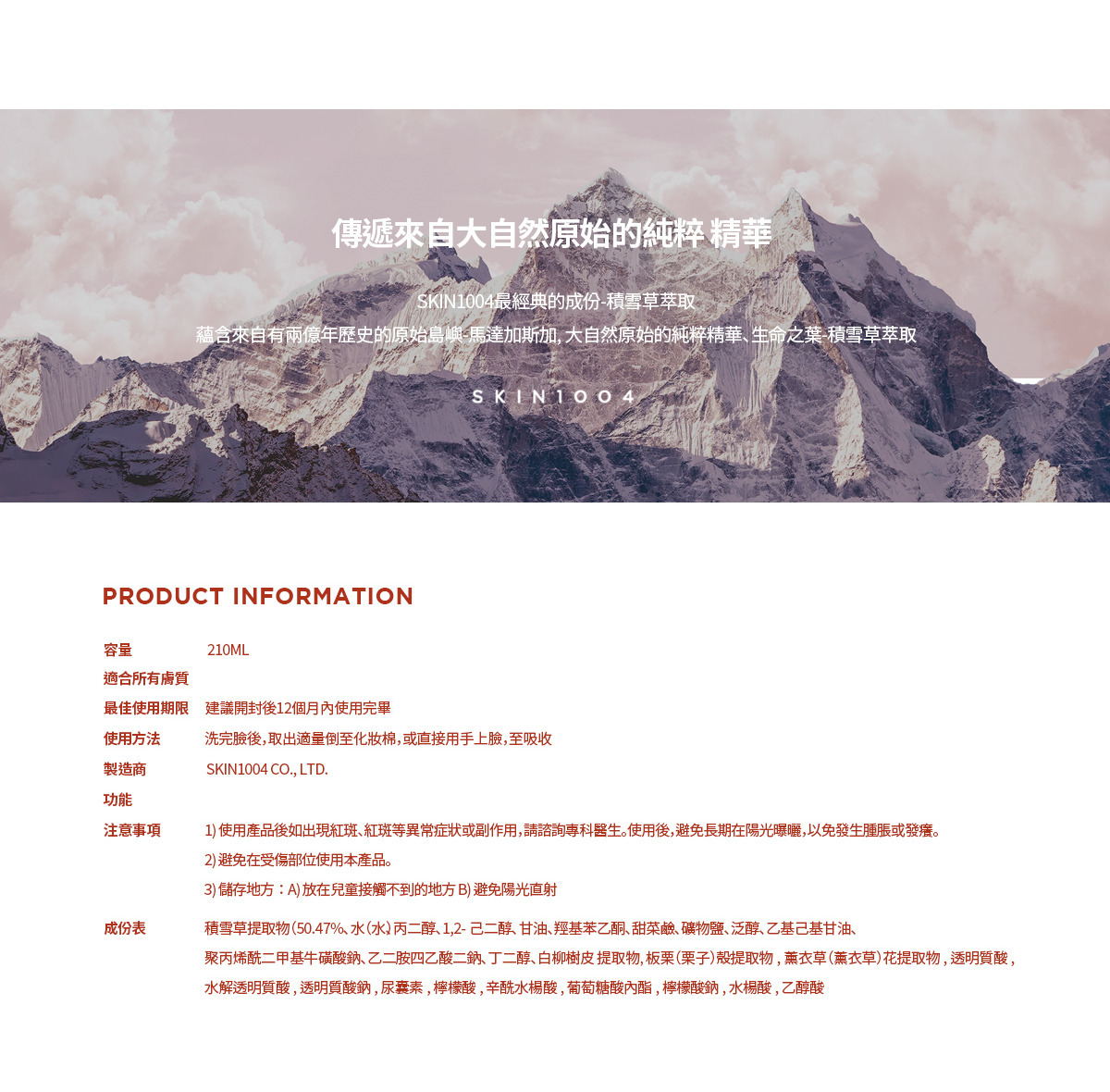 - 含有50%的SKIN1004獨有的優質馬達加斯加積雪草提取物及二聚氰胺、泛醇