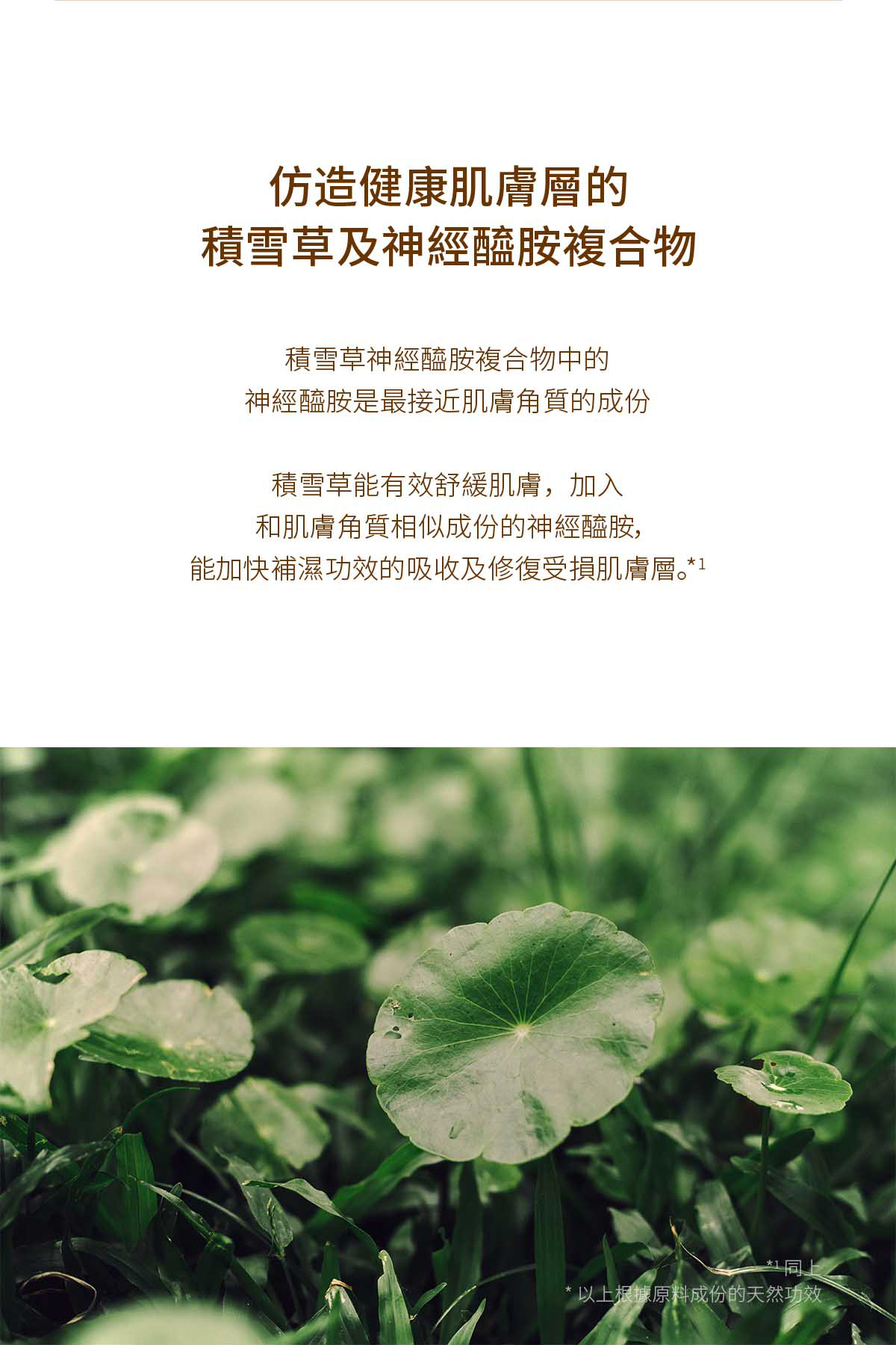 積雪草提取物、甘油、雙甘油、1,2-己二醇、丁二醇、煙酰胺、水、聚甘油-3二硬脂酸酯、辛酸 / 癸酸甘油三酯、