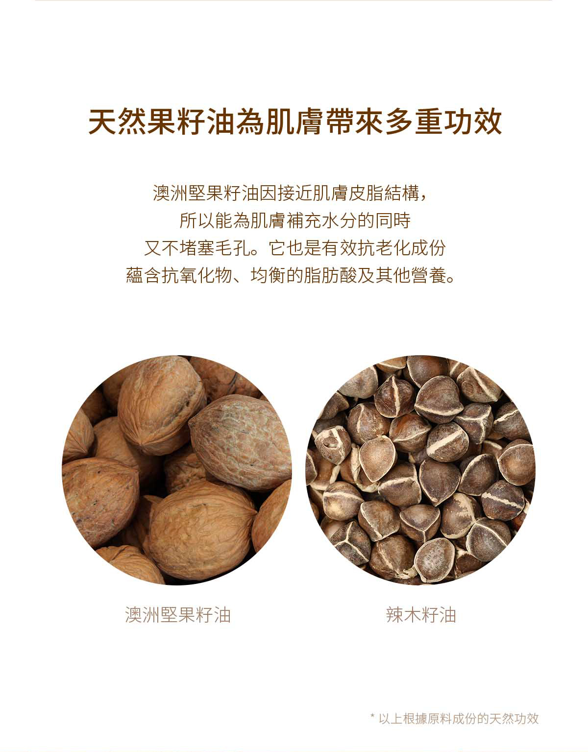 羥基硬脂酸、乙基己基甘油、腺苷、氫化卵磷脂、脫水山梨糖醇油酸酯、辛醇 / 辛基葡糖苷、澳洲堅果籽油、